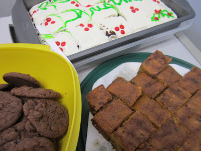 from left: Amy's double chocolate cookies, my Devil's Food cake and pumpkin chocolate chip bars |
